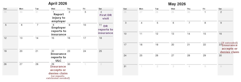 In this example, the worker suffers a work injury on April 1st and reports it to the employer on the same day. The employer has 7 days to report to the insurance carrier, so that deadline is April 8th. The insurance carrier then has 14 days to report to the Industrial Accidents Division of the Utah Labor Commission (ULC), so if the employer notified them on April 8th, then the insurance carrier’s deadline is April 22nd.